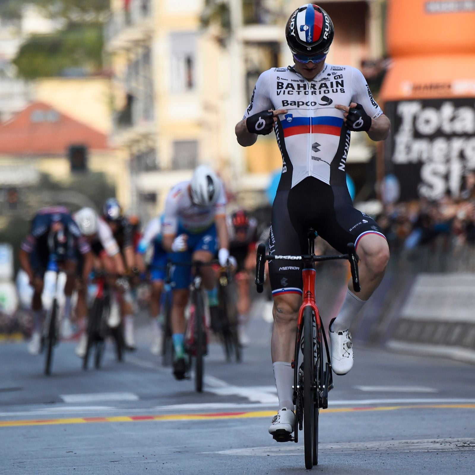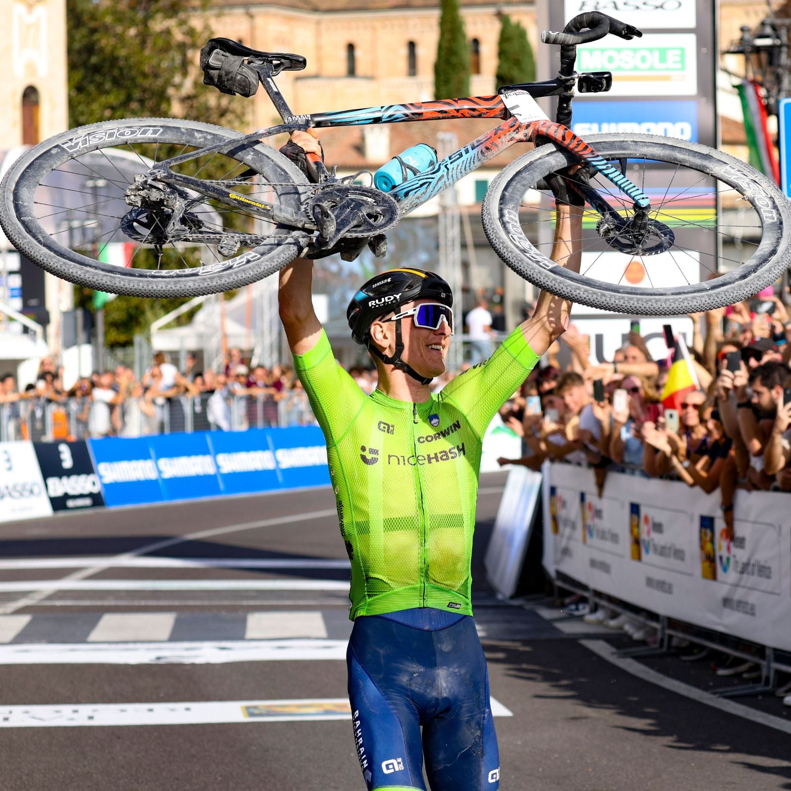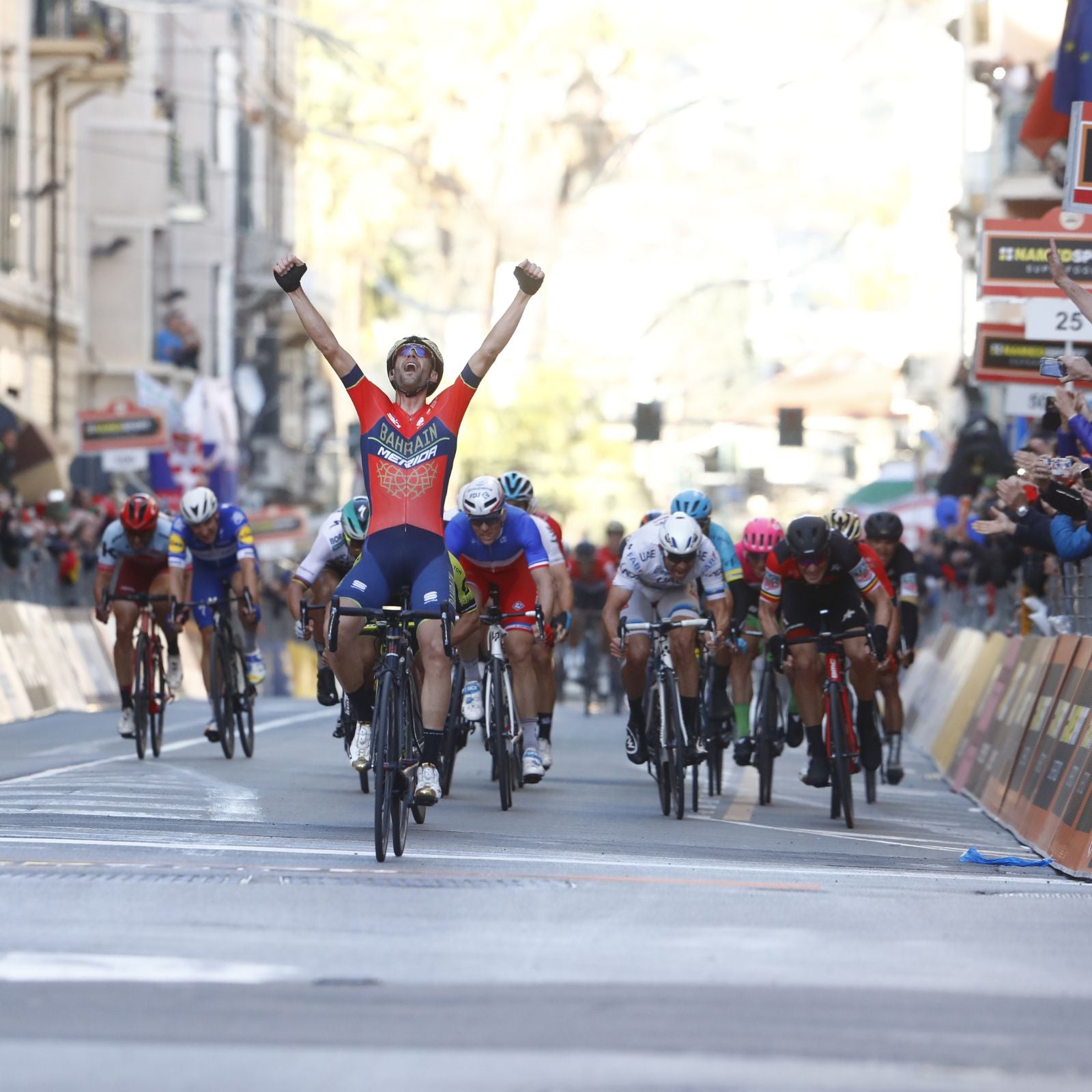Eine gnadenlose Beschleunigung, eine messerscharfe Abfahrt, kein Zurückblicken – er erreichte die Via Roma, während das Feld ins Leere trat, und riss die Arme im letzten Moment hoch.